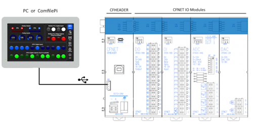 The yellow module on the far left is CFHEADER, the core and mandatory component of the system. It connects to a PC or ComfilePi (Linux-based PC) via USB. Thanks to the USB interface, communication is very fast. More importantly, users do not need to study or implement any communication protocol. By using the library we provide, CFNET can be integrated with simple function calls. We also provide usage examples for developers using C#.